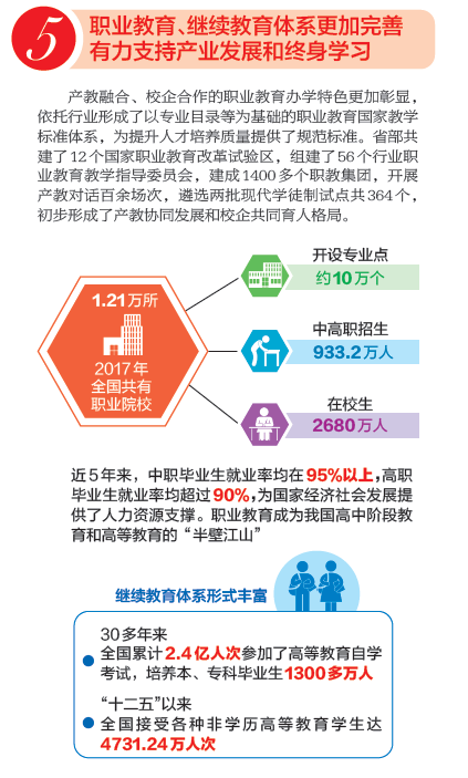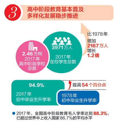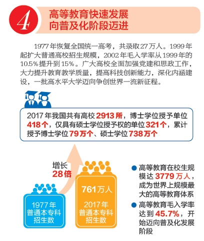 1977年高考全国共录取27万名考生,2017年录取人数增长到761万。40年来,全国劳动力平均受教育年限从5.7年提高到10.5年。从一些国际组织的评价看,我国人力资源开发水平步入中等收入国家行列,实现了从人口大国向人力资源大国的转变。高等教育培养的人才为我国改革开放和社会主义现代化建设提供了强大支撑。