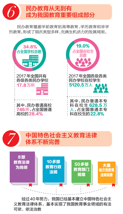 改革开放40年来,我国确立教育优先发展的战略地位,开启了以改革促发展、以开放促改革的伟大历史征程,不断丰富完善党的教育方针,加快推进教育现代化,教育事业发展取得历史性成就,总体水平跃居世界中上行列,培养了一大批高素质人才,为提高全民族的思想道德素质和科学文化素质,促进经济发展、社会和谐、文化繁荣作出了贡献。