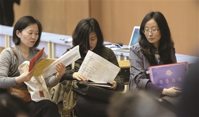 正在等候的家长们在翻阅孩子的获奖证书。吴俊 摄