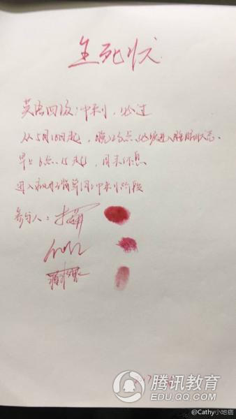 也许你听过去旅游景点要签“生死状”、70岁以上老人坐飞机须签“生死状”、大学生体测要签“生死状”等,但是考四级签下“生死状”的案例,怕是第一次听说吧。近日,网友@Cathy小地痞 在网上晒出了一张四级冲刺“生死状”。