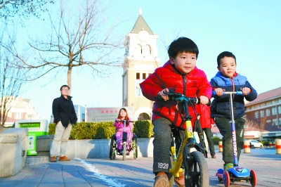 幼儿园放学后,隋毅和家人陪着孩子在楼下小花园玩耍,这是一家人最快乐的时光。
